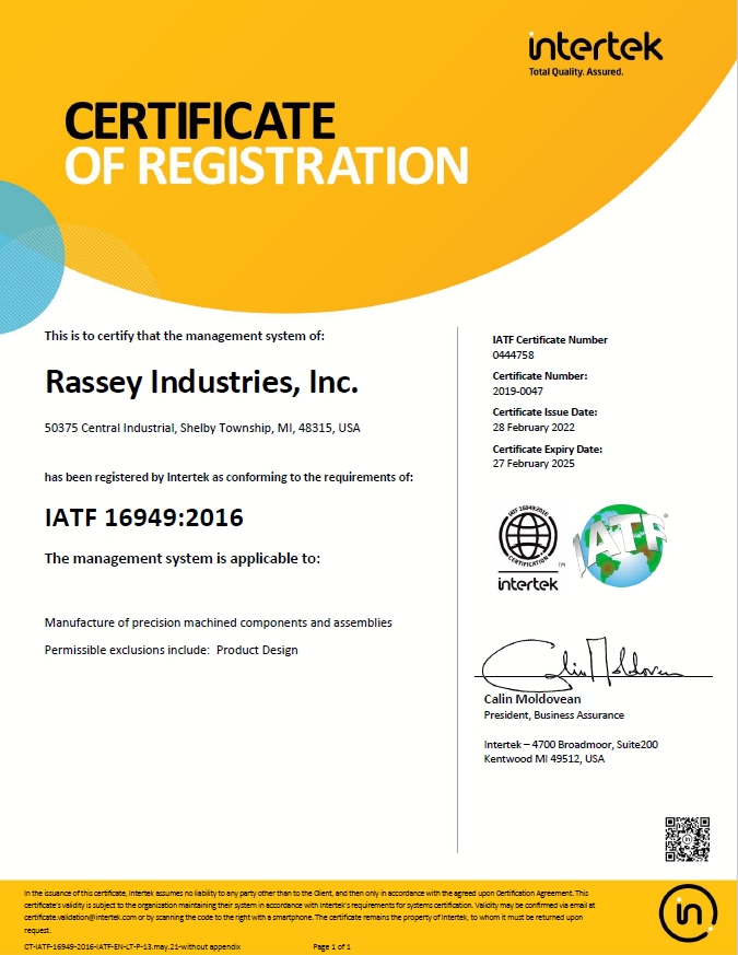 Our goal at Rassey Industries is to continuously improve quality and productivity of all the products we produce with assurance to our customers that all product processes conform to their exact demands. We have an IATF 16949:2016 certification, are Valeo 1000 approved and P.Q.A. certified. We have instituted IATF 16949:2016 procedures in all of our manufacturing processes to ensure that all products meet customer requirements and exceed their expectations. Rigorous advanced quality planning and continuous improvement efforts are in place throughout our manufacturing teams to ensure that our quality always remains consistent to customer demands. Our complete Quality Department enables us to provide incoming, in process and final inspections on all products. We have also included rigid Statistical Process Control procedures to maintain capability of all processes in order to provide the highest quality for our customers. |